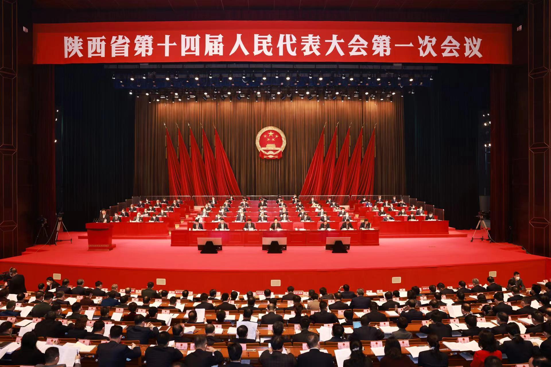 会场庄严简朴,气氛隆重热烈。大会主席台帷幕正中的国徽在鲜艳的红旗映衬下熠熠生辉。主席台对面的眺台上高悬“以习近平新时代中国特色社会主义思想为指导,踔厉奋发、勇毅前行,为奋进中国式现代化新征程、谱写陕西高质量发展新篇章而团结奋斗!”的横幅,鼓舞人心、催人奋进。